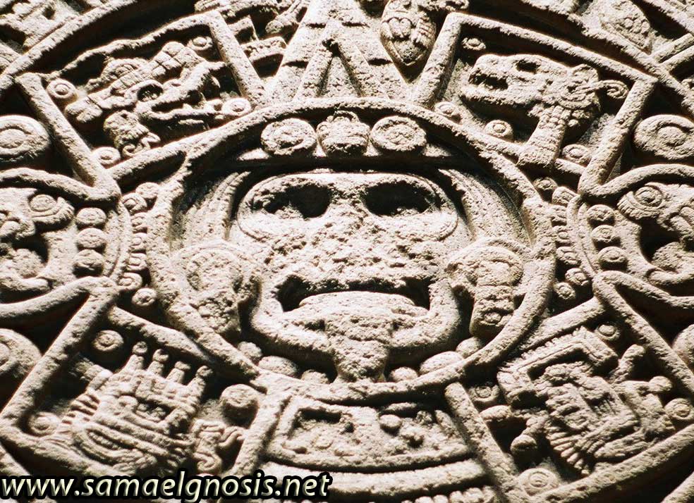 Tonatiuh. Detalle del calendario azteca. Los grandes aretes son símbolo de que sabe escuchar la voz del íntimo Fotografía de Hammurabi Luis Rivera. Datos recopilados por Susana Rodríguez L.